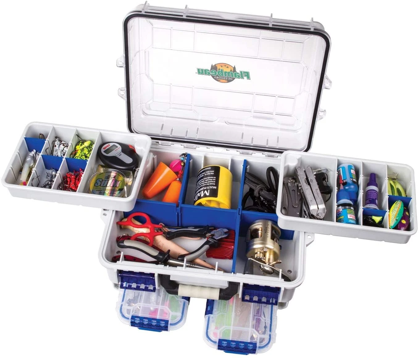 Flambeau Outdoors 3000WPBC waterdichte koffer met 2 WP3012 Ultimate Tuff Tainers inbegrepen, draagbare waterdichte tacklebox met trays en basiskooi, grijs/helder
