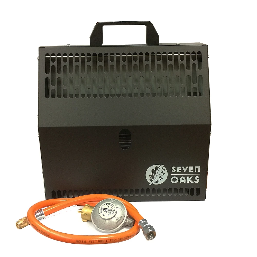 De gastoevoer is ook met kleinere schroef gasbussen te gebruiken door middel van een aparte drukregelaar met schroefdraad. De verwarming wordt onmiddellijk warm als de gewenste warmte is ingesteld. De seven oaks kachel is zo gemaakt dat er totaal geen licht van de warmte af komt, ook wordt de achterkant van de kachel minder warm waardoor deze verder in de tent geplaatst kan worden. Om de veiligheid in een tent te garanderen is deze kachel uitgerust met een CO2 beveiliging. De kachel meet op ieder moment het zuurstofgehalte, als dit te laag is zal hij zich direct uitschakelen. De Seven Oaks kachel is uitgerust met een stevig handvat, een 80 cm slang met snelkoppeling, voetstandaard, wandhouder en een 50mbar drukregelaar.